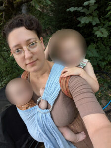 Ich wohne mit meinem Partner, unseren zwei Kindern (geboren 2021 und 2024, werden beide noch getragen) und unseren zwei Katzen (geb. 2017, lassen sich nicht tragen) im St. Johann in Basel.